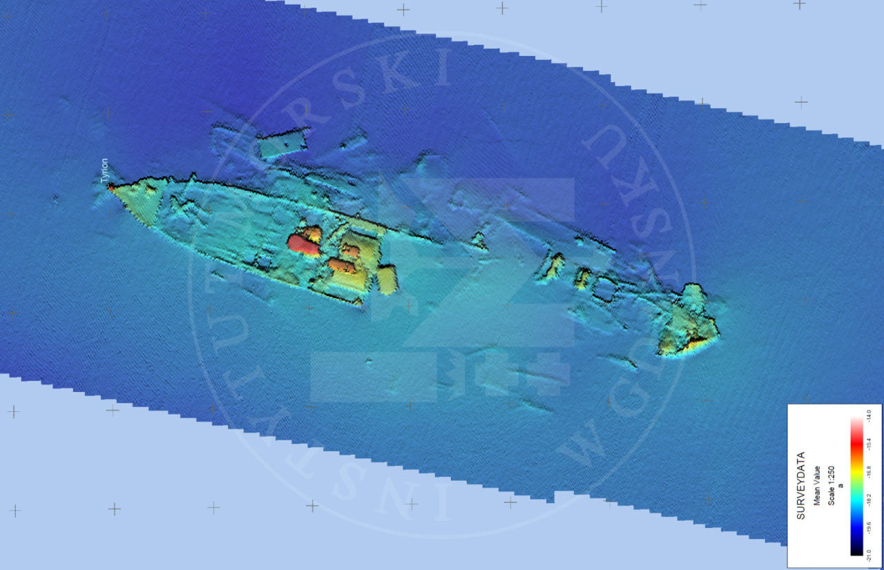 Wrak zachowany w całości, z wyraźnym przesunięciem przedniego pokładu względem osi wraku o kilkanaście stopni. Dziób przechylony na lewą burtę.