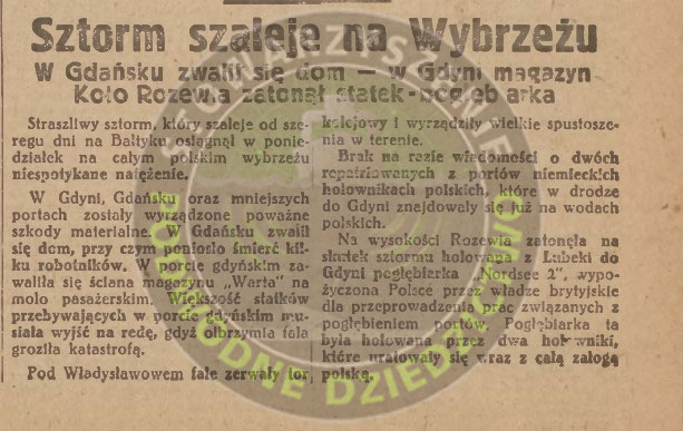 „Na wysokości Rozewia zatonęła na skutek sztormu holowana z Lubeki do Gdyni pogłębiarka „Nordsee 2”, wypożyczona Polsce przez władze brytyjskie dla przeprowadzenia prac związanych z pogłębieniem portów. Pogłębiarka ta była holowana przez dwa holowniki, które uratowały się wraz z całą załogą polską”.